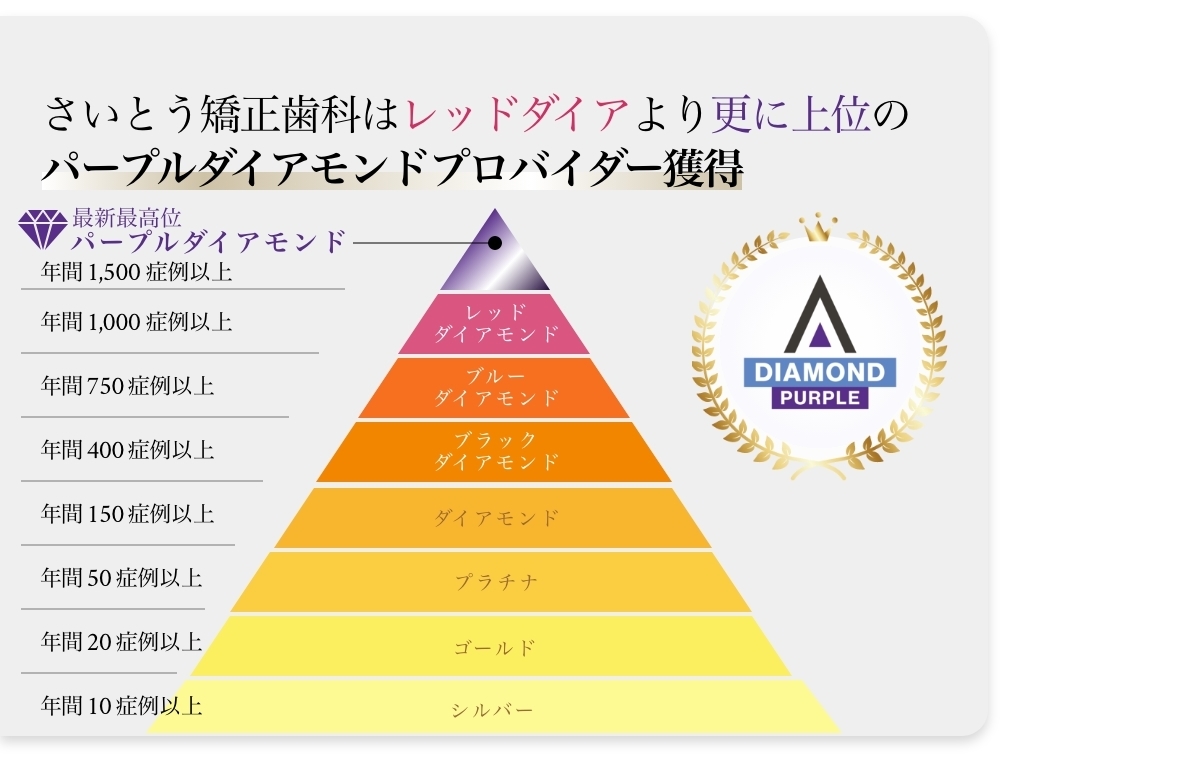 しかし当院ではインビザライン社から10年連続プロバイダーを受賞し、その内5年連続レッドダイヤモンドを獲得、2026年に新たな最高位であるパープルダイヤモンドとなったDr.斎藤 秀也が、全ての治療計画を立て診療にあたっていますので安心してお任せください。